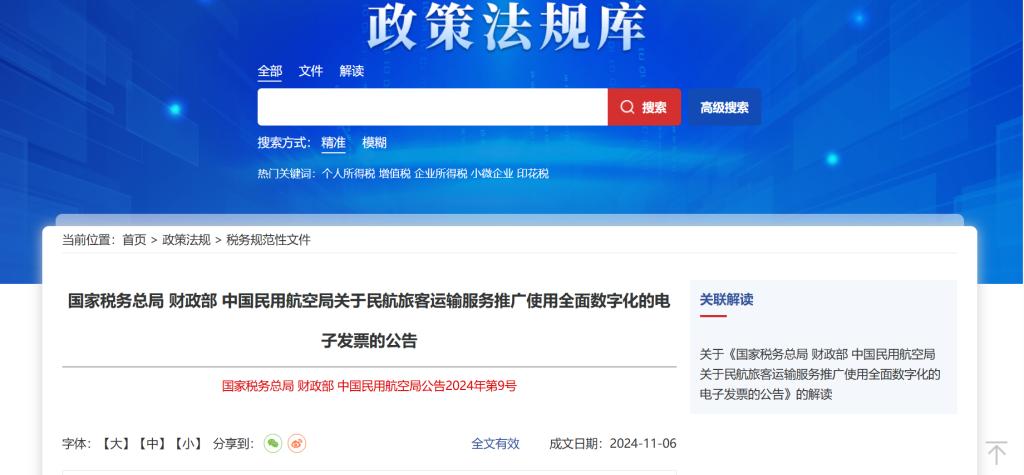 国家税务总局、财政部、中国民用航空局联合对外发布公告,自2024年12月1日起在我国民航旅客运输服务领域推广使用全面数字化的电子发票——航空运输电子客票行程单。