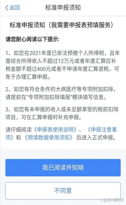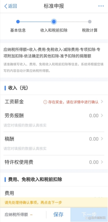 ③填报或者核定“费用”、“收入”、“税前扣除和免税收入”等项目——接着点击“下一步”——系统计算并显示您的“应退税额”或“应补税额”——在确认无误后可点击“提交申报”——勾选“我已阅读并同意”——点击“确认”,即可完成标准申报操作。