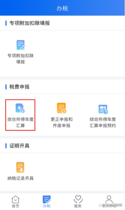 ①登录个人所得税APP,通过下方“办税-综合所得年度汇算”或者“我要办税”或者点击“2021综合所得年度汇算”——“开始申报”发起简易申报。
