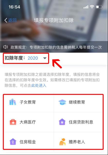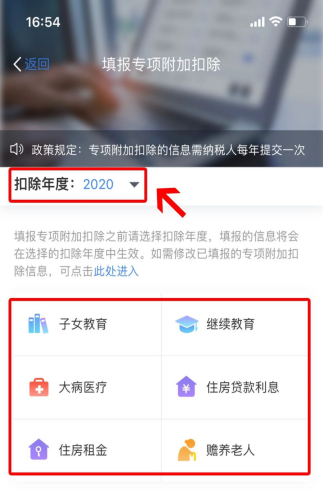 第二步:选择扣除年度“2020”,再选择需要填写的专项附加扣除,填报前准备好所需资料即可。