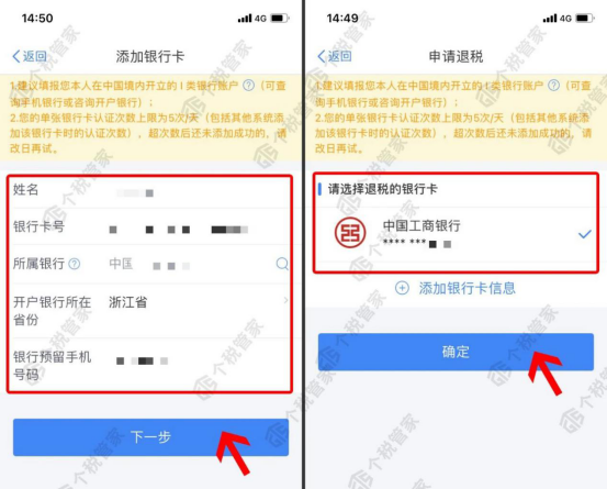 第七步:添加银行卡号及信息,选择退税的银行卡