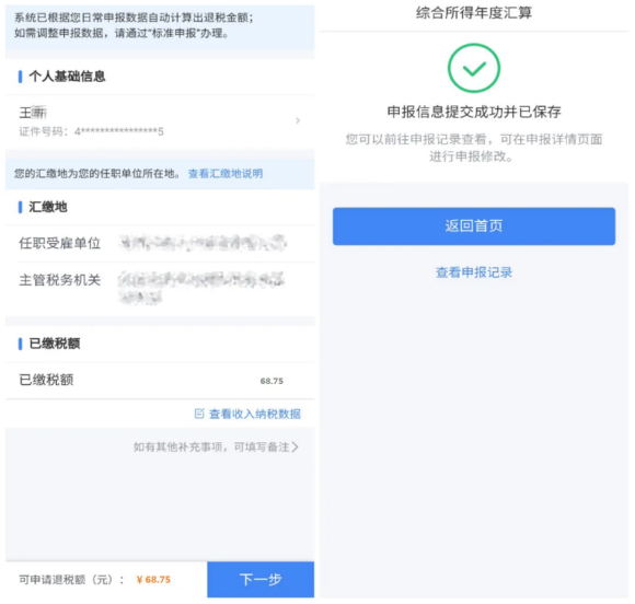 (2)确认预填的收入和扣除信息无误,可直接点击【下一步】。数据系统将自动计算您本年度综合所得应补(退)税额。确认结果后,点击【提交申报】即可。