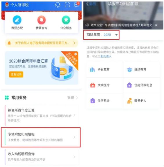 如果您2020年度存在符合条件但未及时填报的专项附加扣除,点击首页【专项附加扣除填报】,选择扣除年度【2020】年。