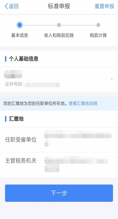 第二步:确认信息、提交申报进入简易申报界面,对界面显示的个人基础信息、汇缴地、已缴税额进行查看、确认。纳税人对相关信息确认无误后,点击【下一步】。